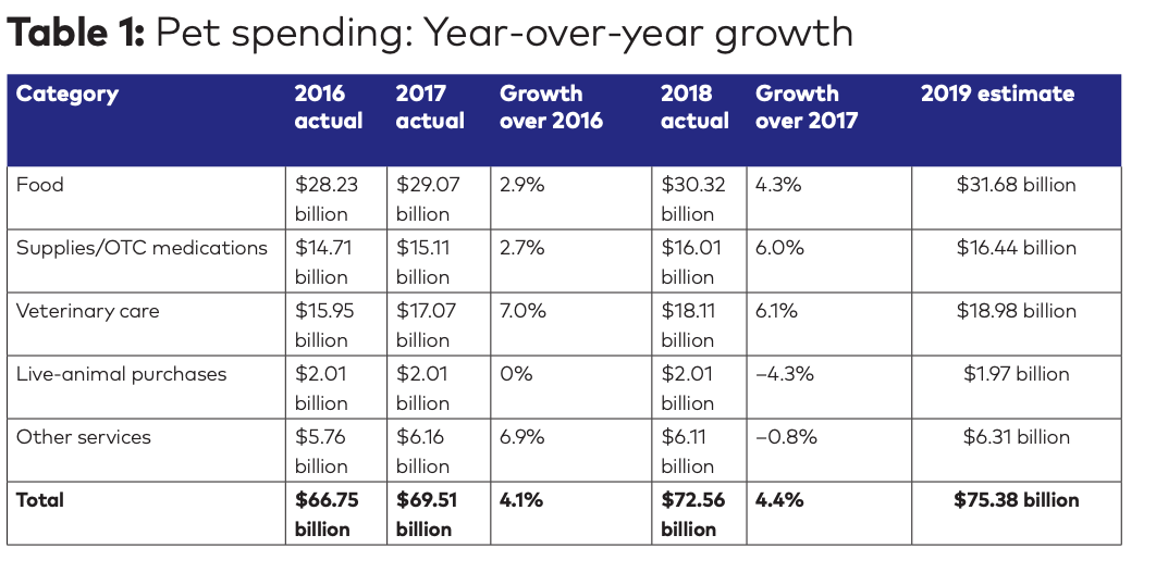New numbers on pet expenditures show growth almost across the board, with Americans spending $72.56 billion in 2018.