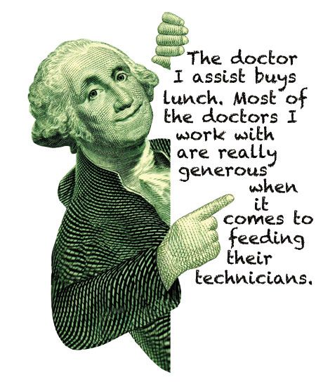 12:30 p.m. Go to lunch. The doctor I assist buys lunch. Most of the doctors I work with are really generous when it comes to feeding their technicians. We always accept, especially on days we don't get a full break because of busy schedules.