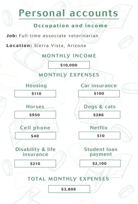 This veterinary associate put a premium on paying back her student debt and also on feeding her three dogs, four cats and three horses as well as about 200 wild birds. The usual.