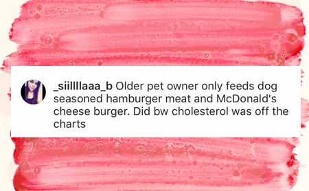“Older pet owner only feeds dog seasoned hamburger meat and McDonald's cheese burger. Did bw cholesterol was off the charts.”