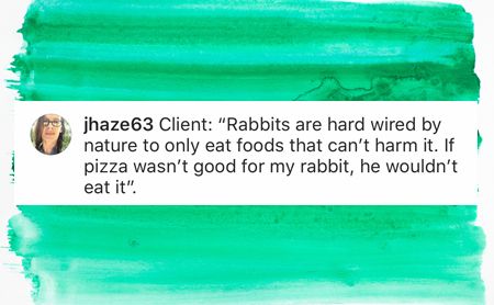 “Client: ‘Rabbits are hard-wired by nature to only eat foods that can't harm it. If pizza wasn't good for my rabbit, he wouldn't eat it.'”