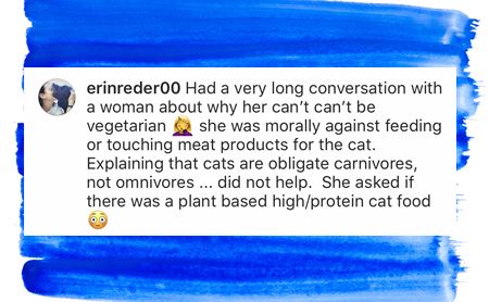 “Had a very long conversation with a woman about why her cat can't be vegetarian. She was morally against feeding or touching meat products for the cat. Explaining that cats are obligate carnivores, not omnivores … did not help. She asked if there was a plant-based, high-protein cat food.”