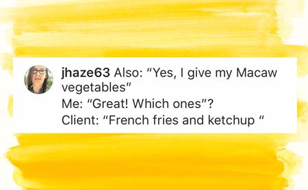 “'Yes, I give my Macaw vegetables.' Me: ‘Great! Which ones?' Client: ‘French fries and ketchup.'”