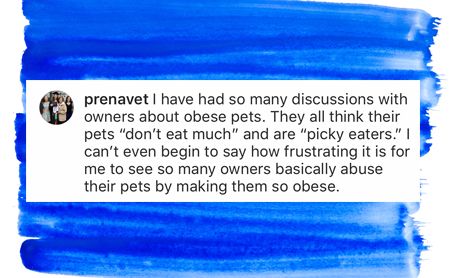 “I have had so many discussions with owners about obese pets. They all think their pets ‘don't eat much' and are ‘picky eaters.' I can't even begin to say how frustrating it is for me to see so many owners basically abuse their pets by making them so obese.”