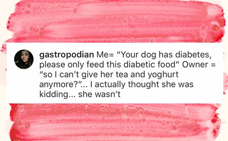 “Me: ‘Your dog has diabetes, please only feed this diabetic food.' Owner: ‘So I can't give her tea and yoghurt anymore?' … I actually thought she was kidding … she wasn't.”
