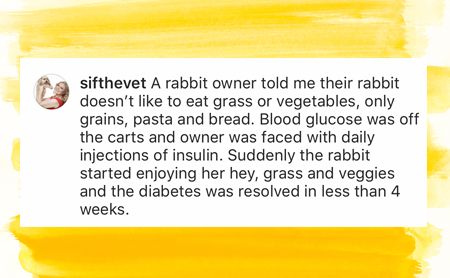 “A rabbit owner told me their rabbit doesn't eat grass or vegetables, only grains, pasta and bread. Blood glucose was off the charts and owner was faced with daily injections of insulin. Suddenly the rabbit started enjoying her hay, grass and veggies and the diabetes was resolved in less than 4 weeks.”