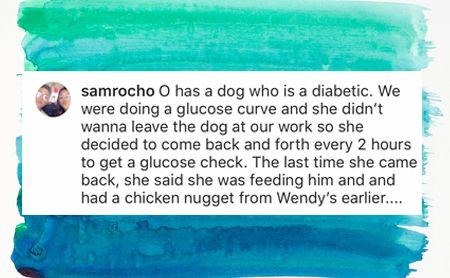 “[Owner] has a dog who is a diabetic. We were doing a glucose curve and she didn't wanna leave the dog at our work, so she decided to come back and forth every 2 hours to get a glucose check. The last time she came back, she said she was feeding him and he had a chicken nugget from Wendy's earlier …”