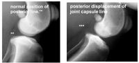 Rear limb lameness: Athletic dogs will exhibit ligament sprains and muscle tendon unit strains of the rear limb. Lameness may be subtle and exacerbated with activity. Examples of muscle tendon unit strain are iliopsoas muscle strain, gracilis muscle strain, and achillis tendon unit strain. The diagnostic modality most useful is ultrasound. There may be muscle/tendon fiber disruption or evidence of hemorrhage/inflammatory effusion surrounding the tendon. Ligament sprains include early partial CCL injury, medial or lateral tarsal collateral ligament injury, collateral ligament injury of the phalanges. Other injuries causing rear limb lameness are isolated meniscal tear or late meniscal injury following surgery for a torn CCL. Of these, an early partial CCL injury is most common. Diagnostic modalities include radiographs, ultrasound, and MRI. Radiographs are generally sufficient for early diagnosis of CCL injury. Early diagnosis is dependent upon radiographic presence of joint effusion. A radiolucent line adjacent to the caudal joint capsule is representative of fatty tissue in the space between the joint capsule and popliteal muscle. Caudal displacement of this line is representative of joint effusion. This is one of the earliest radiographic indications of partial anterior cruciate ligament injury. As changes progress, typical radiographic signs of DJD will be noted.