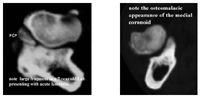 Modalities to facilitate an accurate diagnosis in these cases are CT, nuclear scan, and arthroscopy. Recommendations for performing CT include scanning from the point of the olecranon to 2cm distal to the radial head. Scan thickness should be 1-2mm with .5mm overlapping slice index. Transverse slices using 1500 to 3500 HU are ideal for imaging subchondral bone and fragments of the medial coronoid; transverse images at 3500HU are considered ideal for identifying ostomalacic lesions of the medial coronoid.