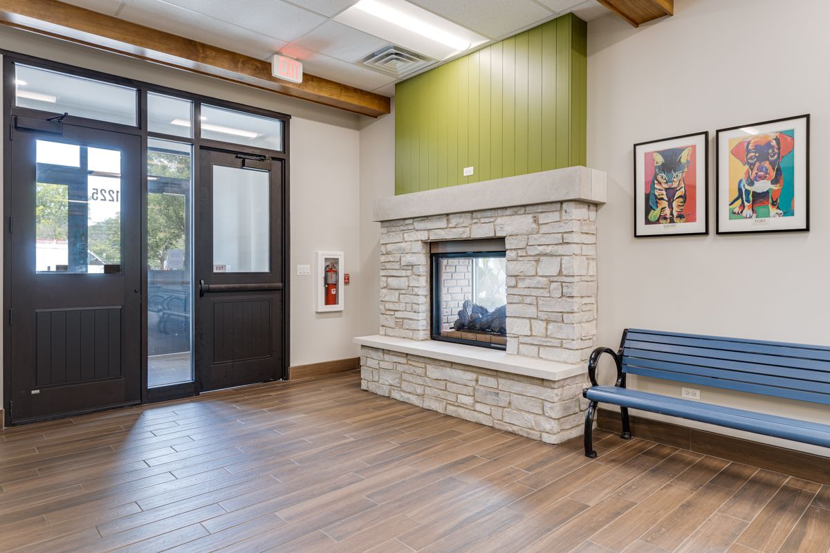 To achieve the hospital’s internal home-like feel, Eisenberg and his father, Ken Eisenberg, a retired veterinarian and co-owner of All Creatures Great and Small, modeled their waiting area after a living room, creating a wood-inspired aesthetic. The team used tiling to mimic a hardwood floor, as this more modern material is easier to clean, more durable, and more scratch resistant than regular hardwood flooring. The owners also installed wood beams overhead to replicate the look and function that some individuals might have in the great room of their home, and picture windows that frame the outdoors—similar to the windows used in the front rooms of houses. Moreover, a fireplace with see-through glass on the inside and outside, was installed. The goal of the glass was to provide both the front porch outside and the inside lobby with a fireplace, adding to the “homey” feel of the clinic.