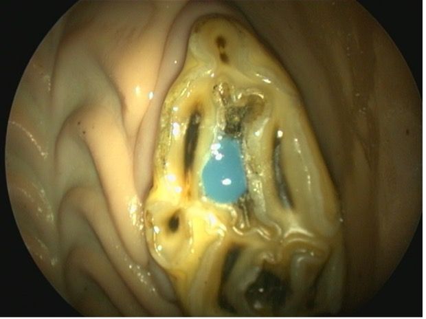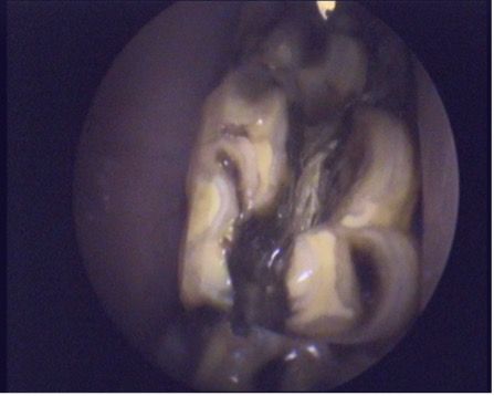 The most common type of dental caries (occlusal exposure of developmental infundibular hypocementosis) identified in equine teeth is maxillary CT infundibular cemental caries (Figure 3A). If left untreated, this can progress to septic pulpitis or pathological fracture.9 In most cases, treatment consists of debridement and filling with dental material to prevent further evolution of the tooth decay. To summarize, necrotic, impacted food material must be removed from the infundibulum using dental picks and a high-speed dental drill or burr (Figure 3B). The infundibular cavity is then flushed, and disinfectant solutions such as dilute sodium hypochlorite or chlorhexidine are flushed into the cavity preparation (Figure 3C). A layer of a single step-etch bonding product is applied to the cavity walls, and the cavity is filled with a dual-cured flowable resin composite.10-12 (Figure 3D)