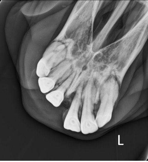 This condition primarily affects the intra-alveolar aspect of the teeth, most commonly incisors and canines, although cheek teeth can also be affected. Odontoclastic cells have been found to cause resorptive lesions extending into the cementum, enamel, dentin, and even the pulp, causing a marked loss of normal architecture in some teeth.13,14 This painful condition can present with absent to variable clinical signs, including masticatory problems. The veterinarian often makes the diagnosis by oral examination and radiographs (Figure 4) or advanced imaging. Findings upon oral examination include gingivitis, fistula formation, gingival recession, deposition of calculus, and swelling or abnormal tooth mobility. Tooth resorption and bulbous enlargement are frequent features on radiographic examination. Currently, surgical extraction of the affected teeth is the treatment option of choice. Supportive therapy with systemic antibiotics, anti-inflammatories, and local mouthwash has been shown to provide only short-term relief of symptoms at best.15