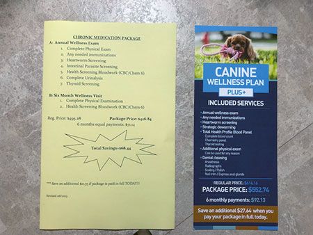 The puppy and kitten plans start at 8 or 12 weeks, which determines how many vaccines the pet receives. The adult dog wellness packages have a plan that includes an annual wellness exam, parasite testing and needed vaccines as well as baseline bloodwork. The next level of package is all of that plus a dental procedure with radiographs. The last of the dog wellness packages is all of the above, but offers two dental cleanings during the year. The cat plans are the same, but we don't offer the two-dentals-a-year plan.