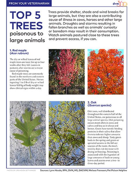 Trees provide shelter, shade and wind breaks for large animals, but their owners may not know these beautiful trees are also a contributing cause of illness. Typically, animals with adequate nutrition will not browse foliage or ingest leaves or seeds, but drought, storms resulting in fallen branches, curiosity or boredom may result in their consumption. Careful attention must be paid to animals pastured close to these trees, and every effort must be made to prevent access.