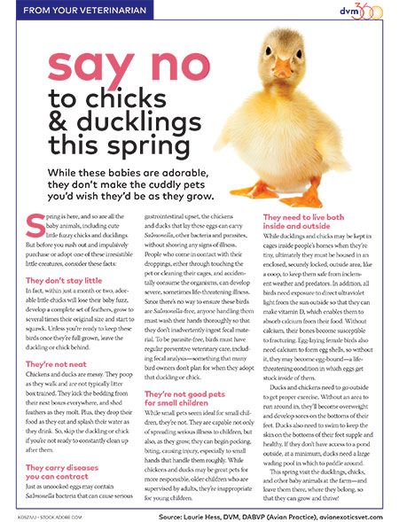 Spring is here and so are all the baby animals, including cute little fuzzy chicks and ducklings. Before veterinary clients rush out and impulsively purchase or adopt one of these irresistible little creatures, use this handout to help them understand the commitment these birds really are.