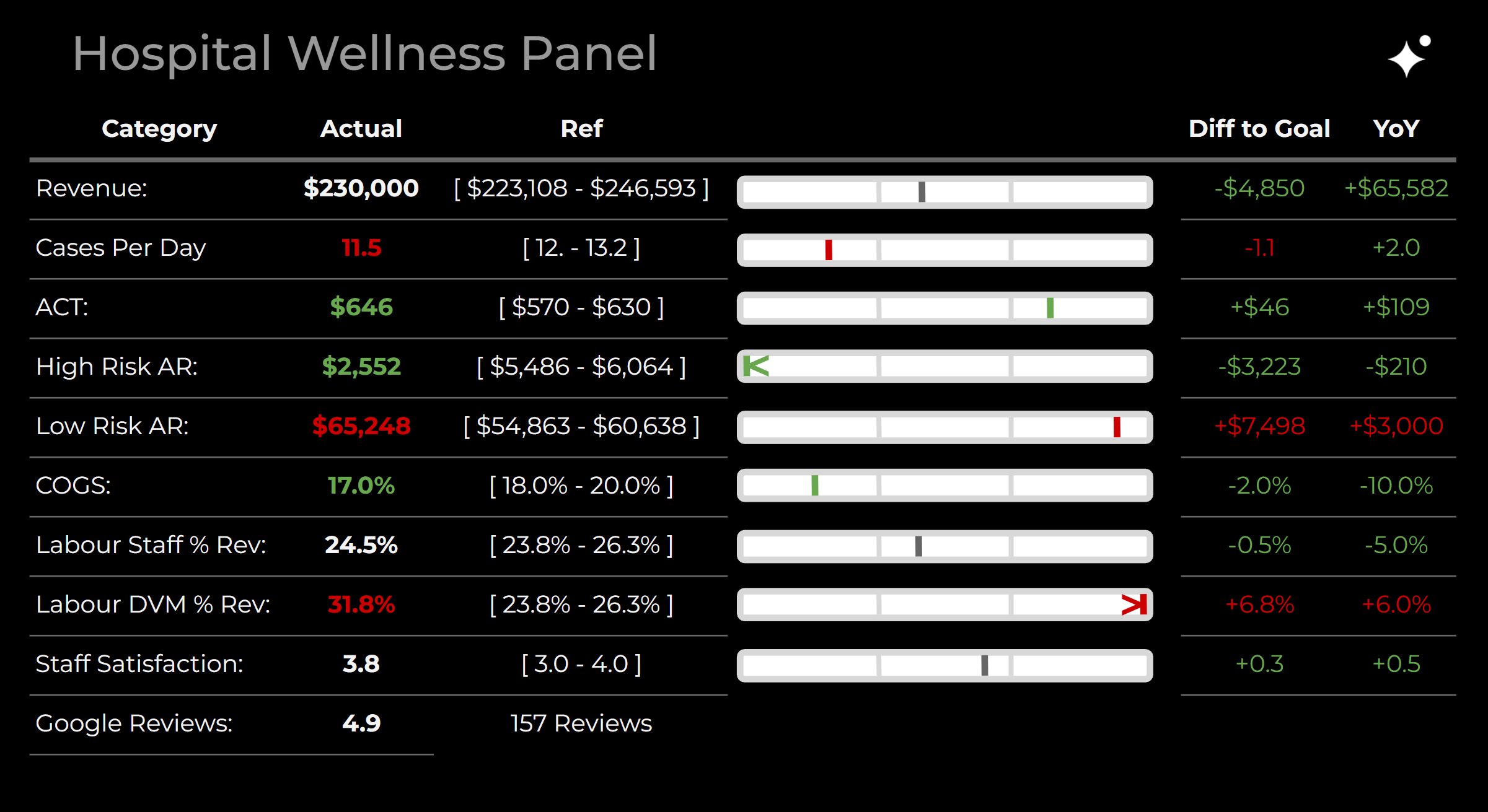 Veterinary teams look at diagnostic panels every day. They are used to reading values in relation to a reference range, spotting trends, and comparing current results to previous baselines. So we applied that same logic to our business metrics.