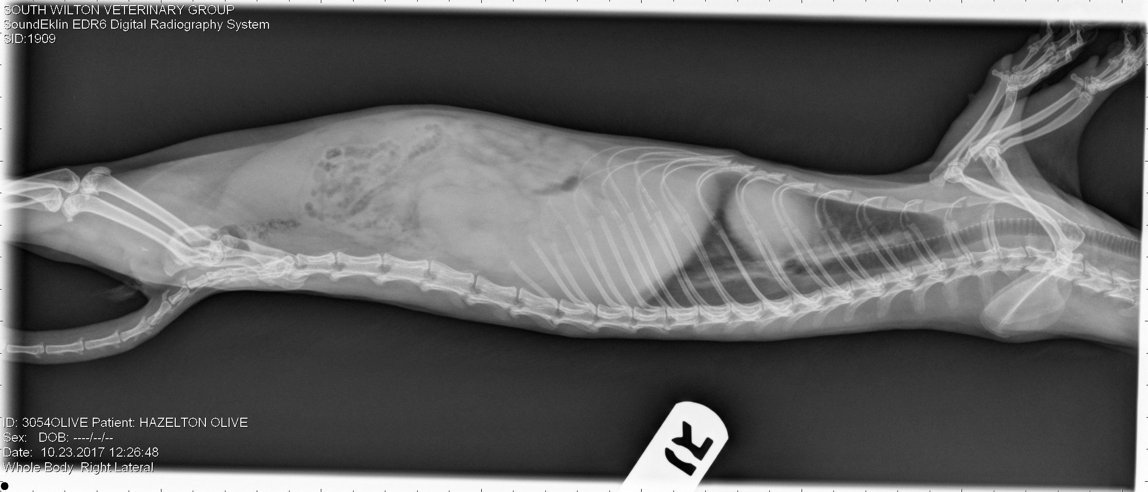After initial triage and physical examination, a complete blood count, chemistry panel, and radiographs were performed. Blood work showed mild leukocytosis (8.3 103/mL), elevated hematocrit (59%), low creatinine (0.1 mg/dL) and serum urea nitrogen (9 mg/dL), and elevated cholesterol (365 mg/dL). Full-body radiographs revealed abnormal contour to the right kidney as well as generalized dehydration but otherwise normal serosal detail and no evidence of a foreign body or obstruction.
