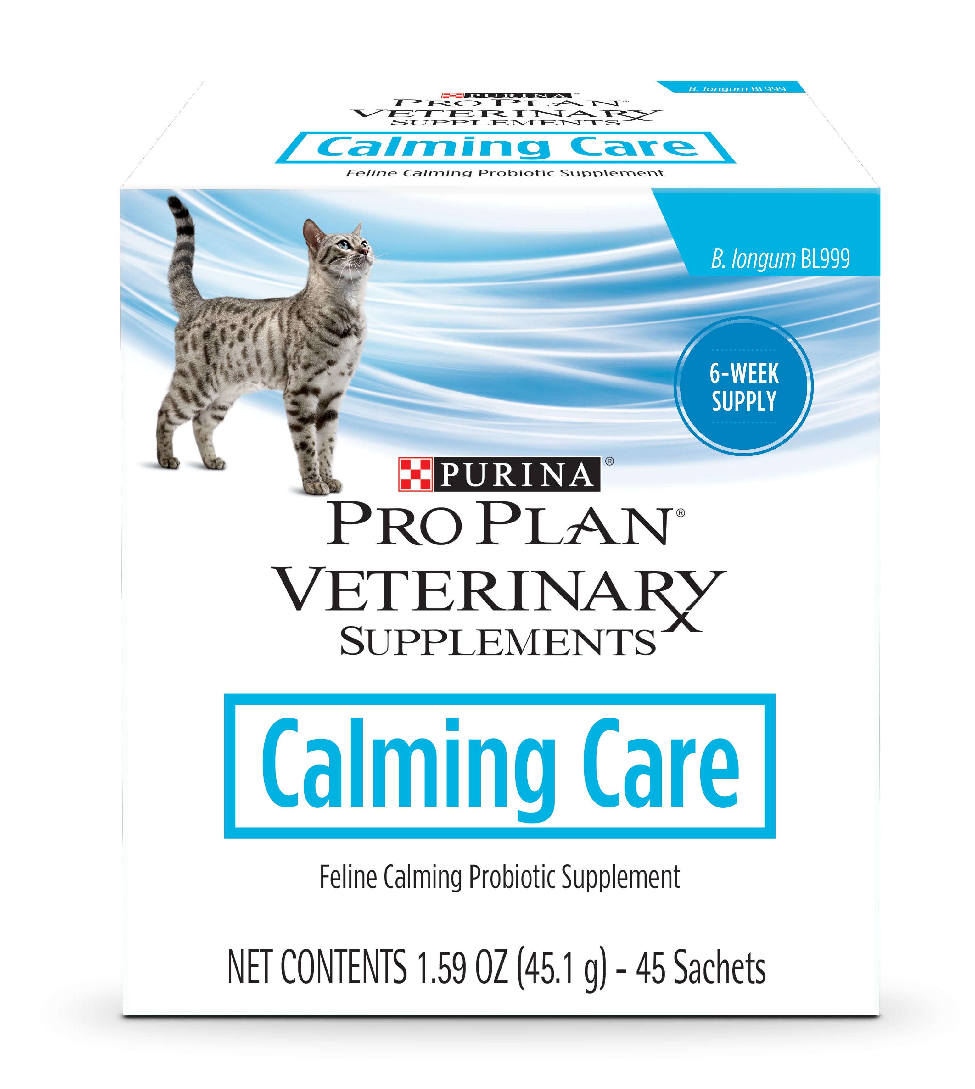 Purina Pro Plan Veterinary Supplements Calming Care for cats contain Bifidobacterium longum (BL999), a probiotic strain shown to help promote calm behavior in felines. Calming Care aids cats in managing changes in routine and location while encouraging positive behaviors (eg, playing, seeking out social contact). Because diet-related changes in gut microbiota can influence the brain via the gut-brain axis and therefore, may influence anxious behaviors, BL999 targets the gut-brain axis to alter anxious behavior. Calming Care is packaged in boxes of 45 sachets. It should be supplemented daily for at least 6 weeks to evaluate efficacy.