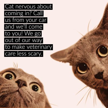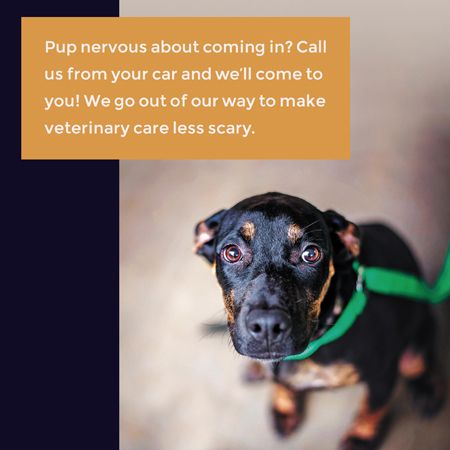 Click to enlarge image. Credit: Shutterstock.com, Adobe SparkText-only tweet: Pet nervous about coming in? Call us from your car and we can come to you! We will go out of our way to make vet care less scary.