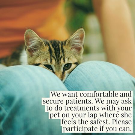 Click to enlarge image. Credit: Shutterstock.com, Adobe SparkText-only tweet: We want comfortable and secure pets. We may ask to do treatments on your lap where your pet feels the safest. Please participate if you can.