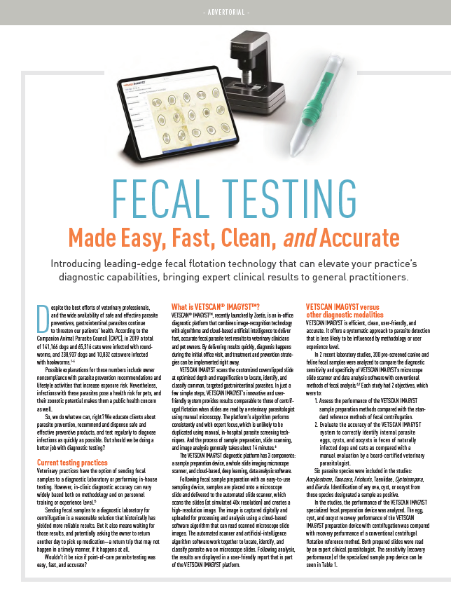 VETSCAN® IMAGYSTTM, recently launched by Zoetis, is an in-office diagnostic platform that combines image-recognition technology with algorithms and cloud-based artificial intelligence to deliver fast, accurate fecal parasite test results to veterinary clinicians and pet owners. By delivering results quickly, diagnosis happens during the initial office visit, and treatment and prevention strategies can be implemented right away.
