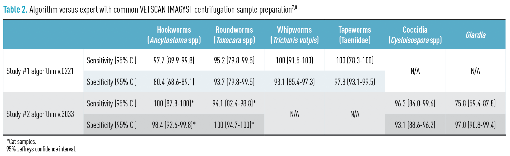 The 2 studies demonstrated that the algorithm performed well versus a parasitologist evaluating the sample with expert focus and attention, something that is less likely being done with each internal parasite screening in everyday practice.7,8