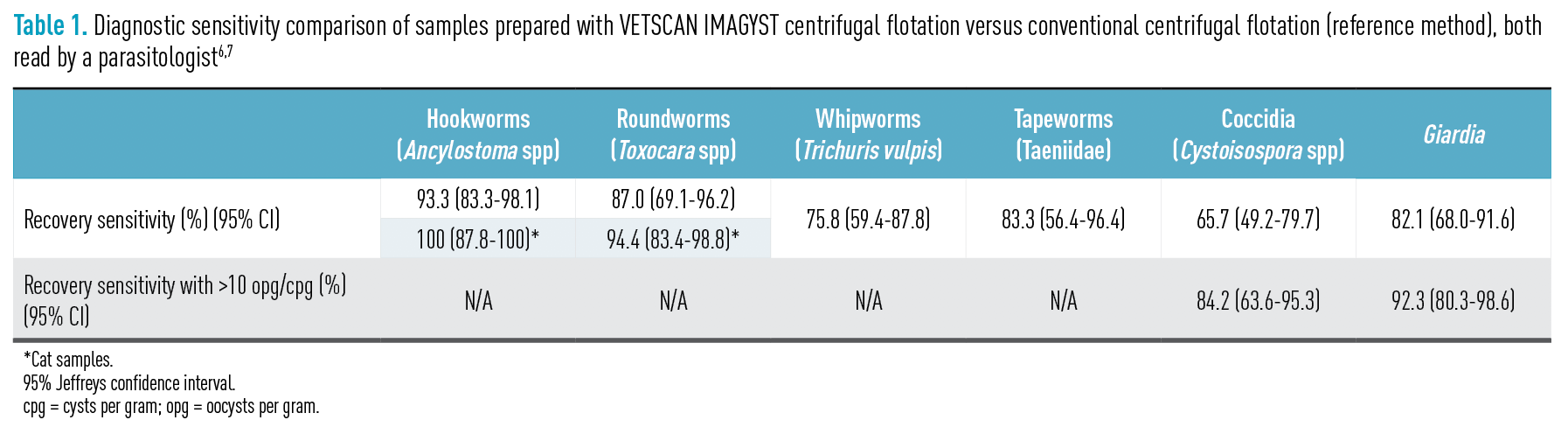 In the studies, the performance of the VETSCAN IMAGYST specialized fecal preparation device was analyzed. The egg, cyst, and oocyst recovery performance of the VETSCAN IMAGYST preparation device with centrifugation was compared with recovery performance of a conventional centrifugal flotation reference method. Both prepared slides were read by an expert clinical parasitologist. The sensitivity (recovery performance) of the specialized sample prep device can be seen in Table 1.