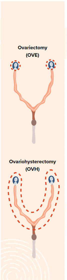 The major benefit of an OVH is the ability to remove the uterine tissue along with the ovaries. Therefore, when uterine pathology is present, including congenital uterine abnormalities, pyometra, mucometra, cystic endometrial hyperplasia, uterine torsion, uterine prolapse, uterine rupture, and/or uterine neoplasia, an OVH is preferred over an OVE.