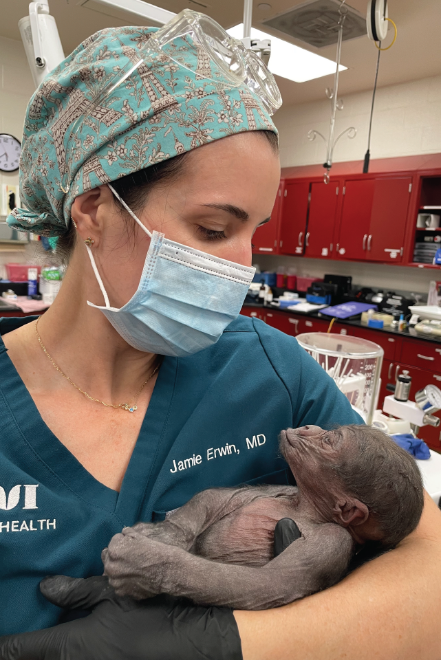Jamie Walker Erwin, MD, board-certified in obstetrics and gynecology who has worked with the zoo to consult on cases since 2016, was called to help with Sekani. Erwin assembled a team of volunteer medical professionals to assist with the delivery process and on January 5, 2024, the team successfully performed the C-section and immediate care to a premature Jameela.