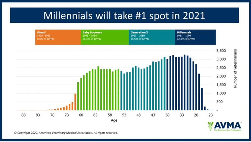 The veterinary workforce includes 4 generations: silents (born 1928-1945), baby boomers (1946-1964), Generation X (1965-1980), and millennials (1981-1996). Each generation has its own cultural tendencies and characteristics shaped by shared life experiences. That means that as millennials surpass the other age groups and baby boomers continue to reach retirement age, we’ll see a shift in the collective behaviors and attitudes of veterinarians and changes in the veterinary profession overall.