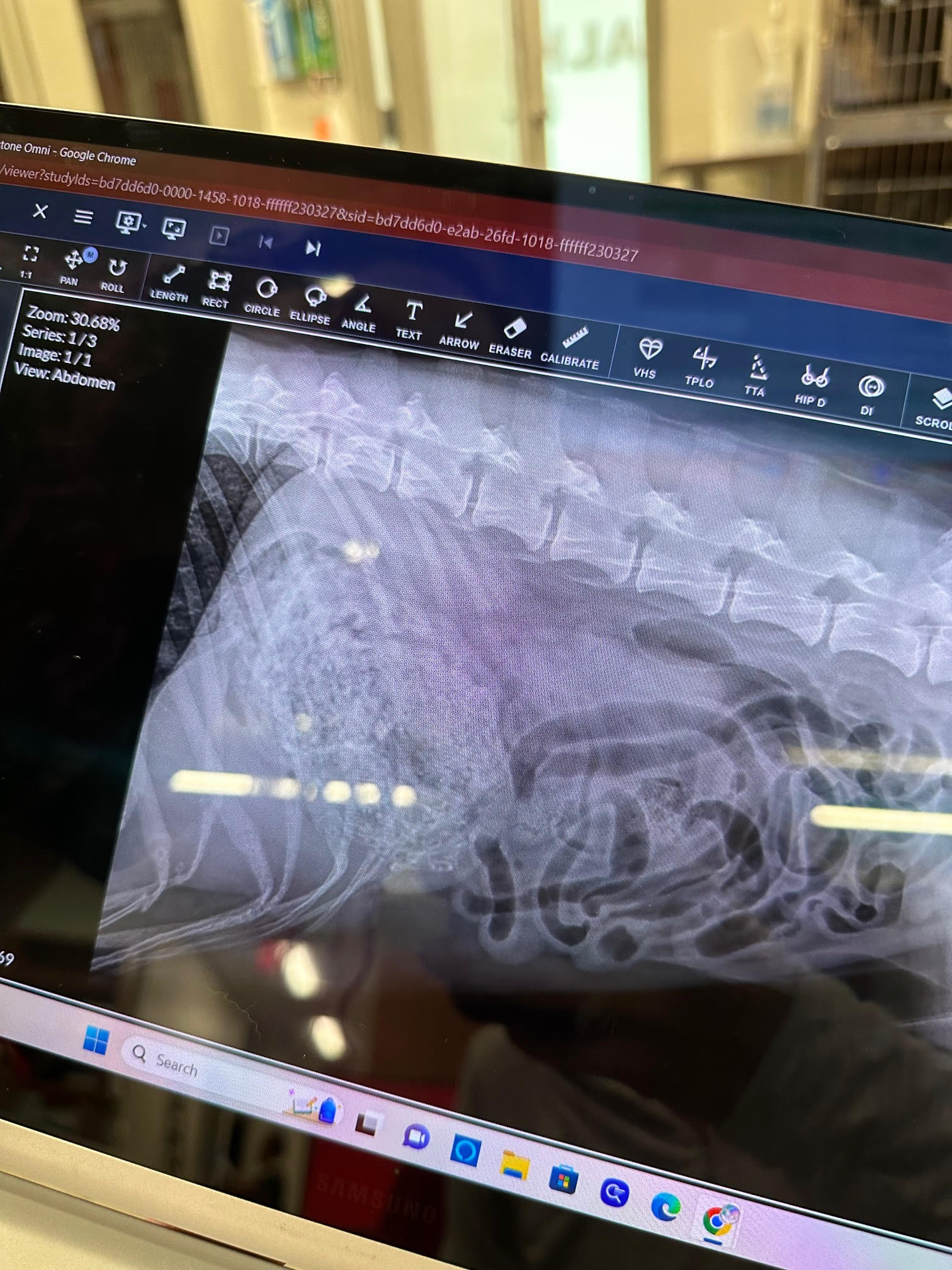 Unfortunately, on Sunday Sawyer was still not feeling well and was reported as lethargic, so Manzo took him to an emergency veterinary hospital which did an x-ray, but the veterinarian originally thought an image he saw was food in his stomach. The next day, the veterinarian called Manzo back and explained there might be an object lodged in Sawyer’s stomach. He recommended another visit to the hospital, so this time Manzo drove him about 30 minutes to the Veterinary Emergency Group (VEG) in Charlotte, where they took more x-rays and did an ultrasound.1