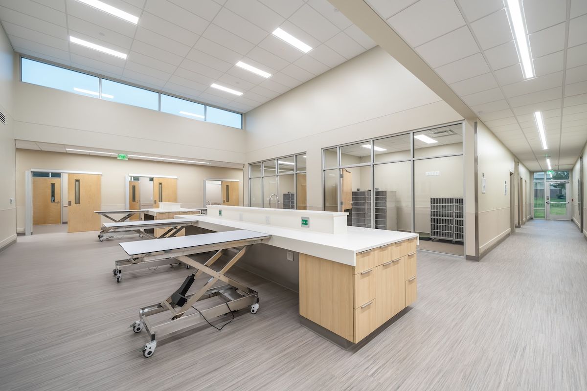 Located on a campus of over 72,000 sq ft, the Arizona Humane Society complex contains state-of-the-art medical, adoption, and education spaces that allow the team to provide the best care to pets in need and help them find their forever homes. To create the best hospital for their staff, patients, clients, and community, the team dedicated time to tour animal shelters that opened their doors to them. During the tours, the team was able to handpick features and aspects of different hospitals to create spaces in their hospital, such as 11 animal ambulances to transport sick and injured pets; and a small, dedicated laboratory. They also have a supply space for parvovirus-infected puppies with a separate entrance and an outside area, enabling infected animals to go outside without the risk of spreading the disease.