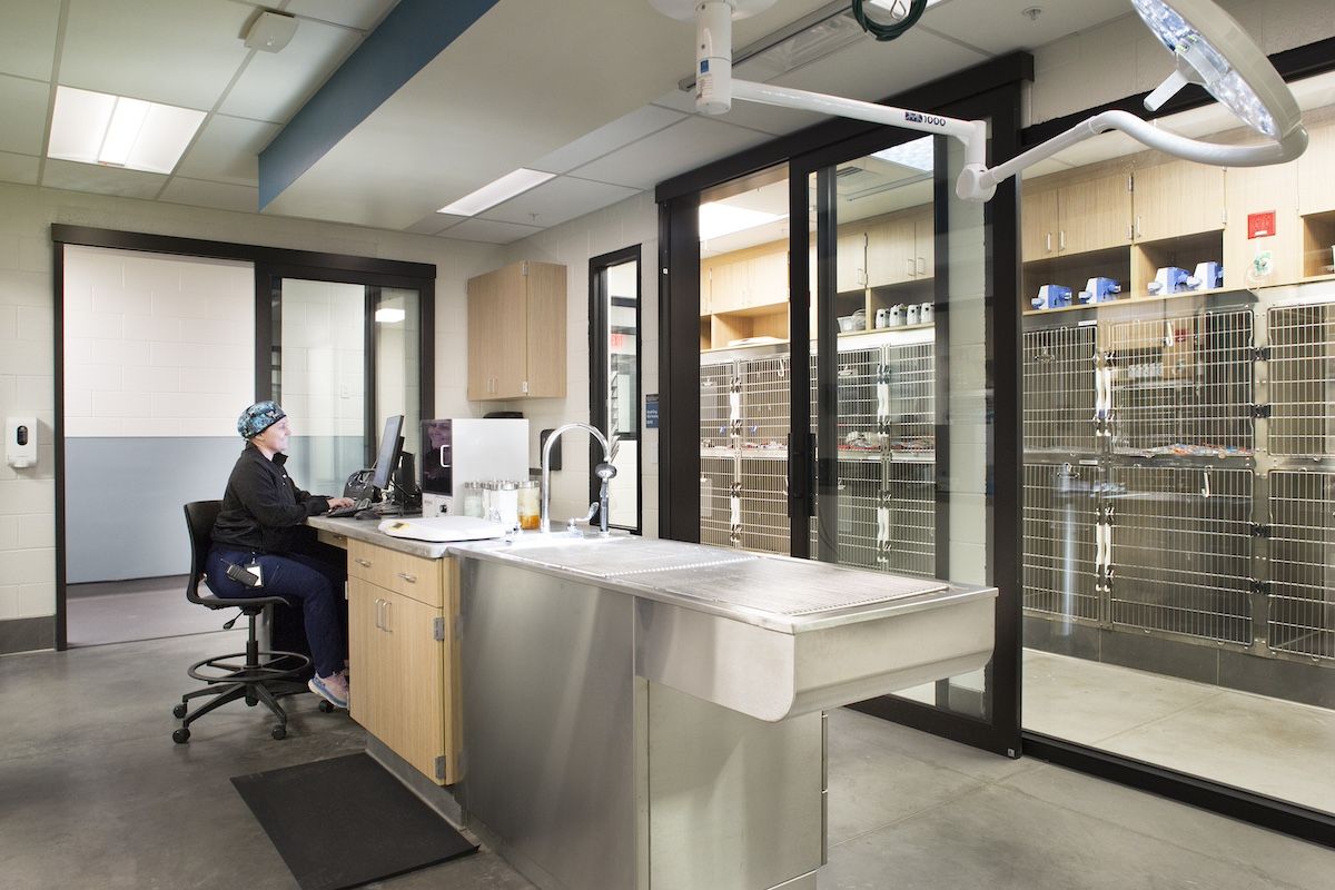 Other unique design features at West Davis Veterinary Center include the veterinarian office at the center of the hospital so the team can see treatment areas as needed, a warmed floor cage for post operation patient recovery, and glass for sound control that does not obstruct the view of patients who may be in distress. The onsite pharmacy has a small glass door that allows the receptionists to ask the team questions directly if needed. The hospital also created a space for technicians to have a moment of quiet and enjoy the natural light featured in most of the hospital, except for the bathrooms, laundry, and radiology rooms.