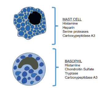 Histamine makes up about 70% of the weight of the basophils and mast cells so these cells pack a big punch. Histamine levels can be measured in plasma within one minute of an anaphylactic stimulus. The effects of histamine are based on the overlapping effect of the 4 histamine receptors.2 Main histamine driven effects are going to include cutaneous changes, respiratory effects, cardiovascular derangements, and GI and hepatobiliary changes. We will discuss more about the clinical presentation, but overall histamine receptor activation will cause vasodilation, increased vascular permeability, bronchoconstriction, heart rhythm disturbances (often tachycardia), and overall decrease in cardiac output driven by reduced cardiac contractility (inotropy).