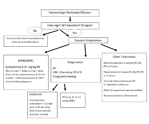 Interestingly, not all dogs with hemoabdomen have been found to have coagulation testing abnormalities again confirming this is a multifactorial cause which can complicate treatment.3,7,8 Hemoabdomen ranging from mild to severe and rapidly fatal can occur and need to be the addressed immediately as the more an animal bleeds, the worse their coagulopathy will become further impeding our ability to treat. If there is evidence of an anaphylactic reaction and hemoabdomen, clotting times or viscoelastic testing should be evaluated but waiting on these tests may not be feasible to prevent worsening morbidity and mortality.