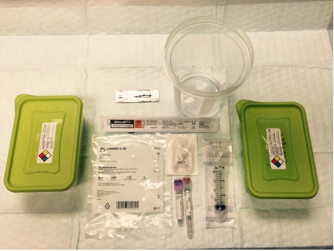 The size of the needle or catheter used is dependent on the size of the animal. In cats, a 19-to-21-gauge butterfly catheter is typically appropriate. In large dogs, a 14- or 16-gauge over-the-needle catheter is used (Figure 7).