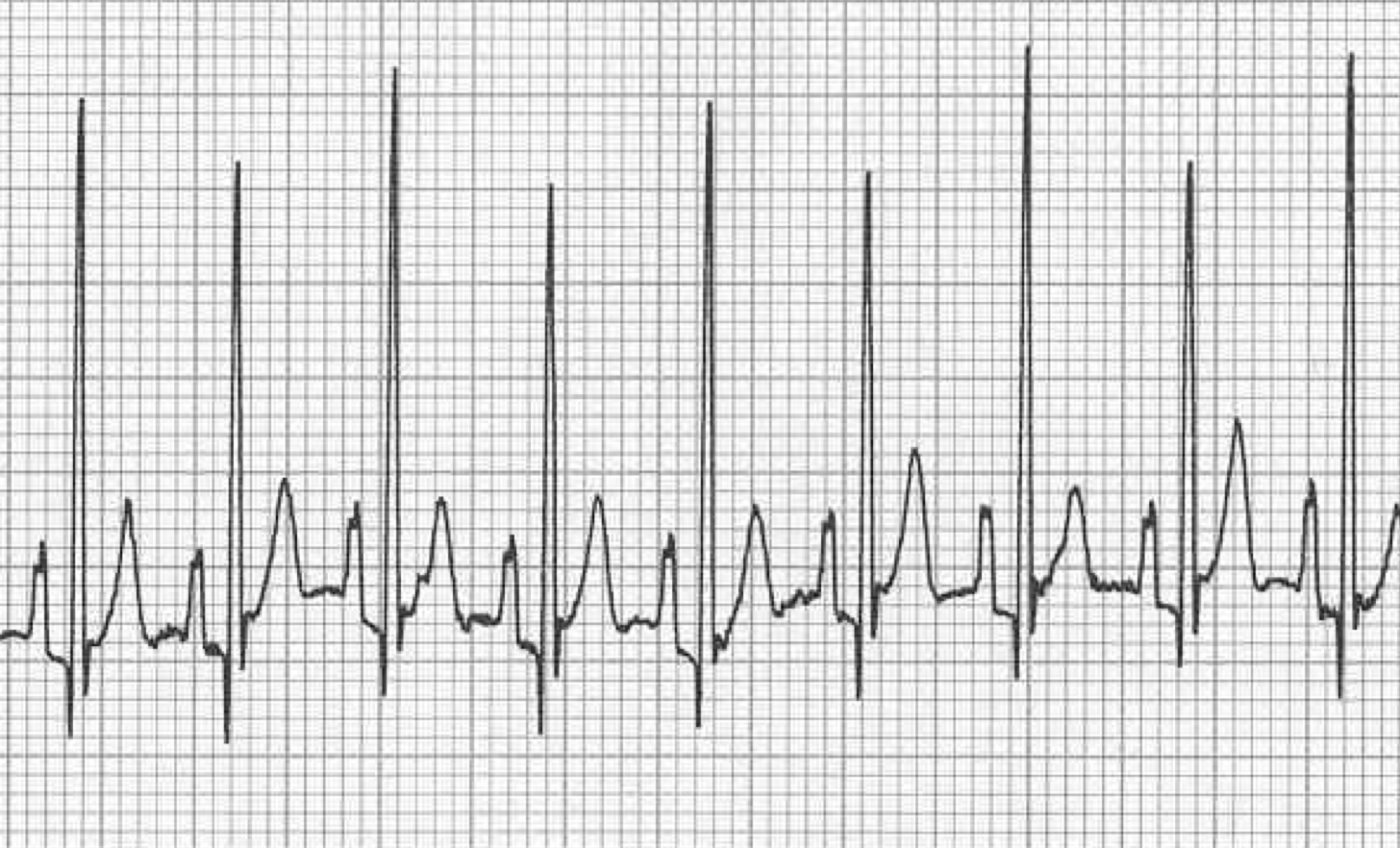 Electrical alternans is a beat-to-beat voltage variation of the QRS or ST-T complexes (Figure 4). It may be recorded in as many as 50% of patients with pericardial effusion. Elevation of the ST segment is commonly recorded in patients with pericardial disease. Reductions in QRS voltage (R < 1 mV in Lead II) are commonly recorded in dogs with pericardial effusion. In the author's experience, arrhythmias other than sinus tachycardia are uncommon in primary pericardial disease.4