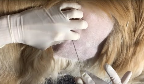 The puncture site is usually determined based on the location of the heart on thoracic radiographs. This is most commonly between the fourth and sixth rib spaces at the costochondral junction. Ultrasound guidance is infrequently necessary unless the volume of effusion is very small, or the effusion is compartmentalized.