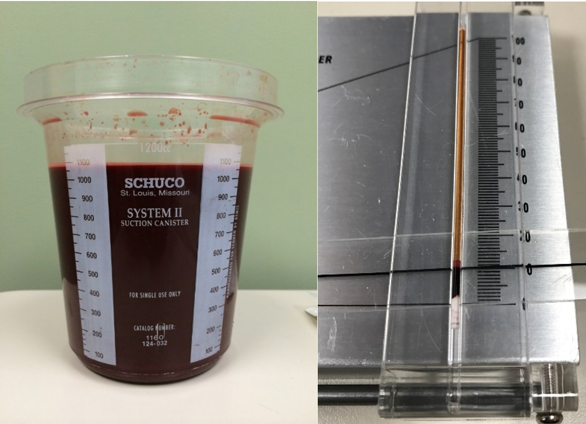 Most pericardial effusions are hemorrhagic and have a "port wine" appearance (Figure 8). Once effusion of this character is obtained, the catheter should be advanced over the needle, and the needle removed. The remainder of the drainage should be performed using the catheter. Advancing the needle too far will result in contact with the epicardium. This is often felt as a tapping or more intense scratching sensation and commonly results in ventricular arrhythmias. These arrhythmias are usually self-limiting following retraction of the needle or catheter.