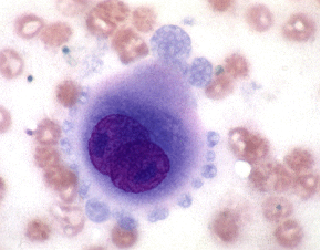Potential complications include cardiac puncture (with resultant hemorrhage or arrhythmias), coronary artery laceration, lung puncture or laceration, and dissemination of infection or neoplasia throughout the thoracic cavity. Diagnostic evaluations of fluid obtained should include PCV and cytologic evaluation. Bacterial culture and sensitivity should be performed if indicated by cytologic evaluation. Caution should be exercised when evaluating the cellular component of pericardial effusion. Clinically important neoplasia of the heart and pericardium (hemangiosarcoma, chemodectoma) commonly do not exfoliate, resulting in frequent false negative evaluations. Reactive mesothelial cells within the pericardial sac are commonly over-interpreted as being neoplastic, causing false positive results (Figure 9).