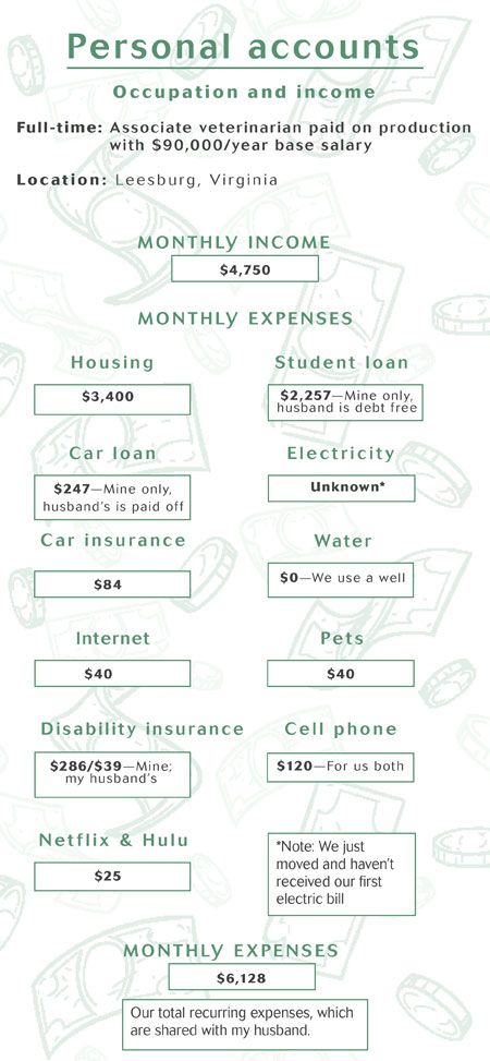 I took a job at a busy small animal general practice. I work on a “production salary” basis, so I'm guaranteed an annual salary of $90,000, and make commission on what I produce for the practice in excess of my annual salary. That means I have to earn the “guaranteed” annual salary before I make any extra. I'm still in my initial 90-day trial at the clinic, so I have no idea how the numbers are looking production-wise, yet. My husband also works full-time, and is lucky to have no education loans.