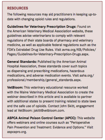 Remaining knowledgeable and observing relevant legal requirements will enable veterinarians to be strong advocates for the responsible use of opioids.
