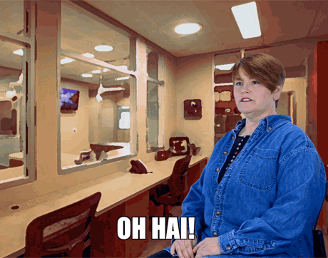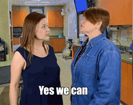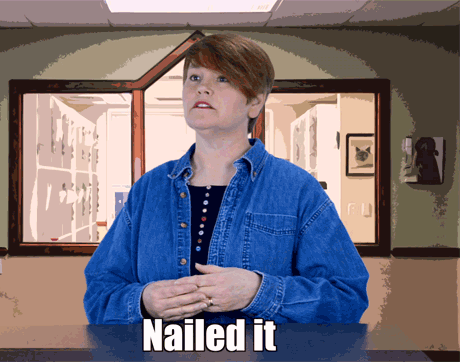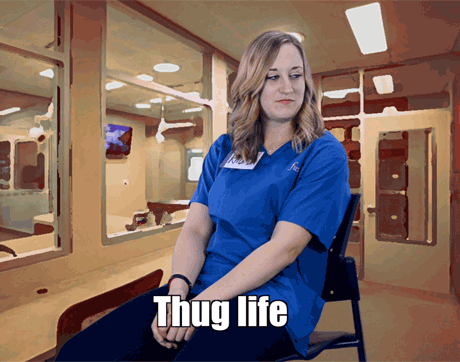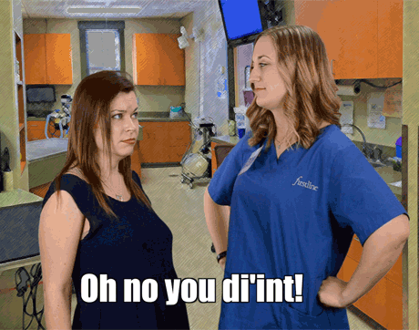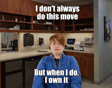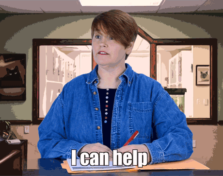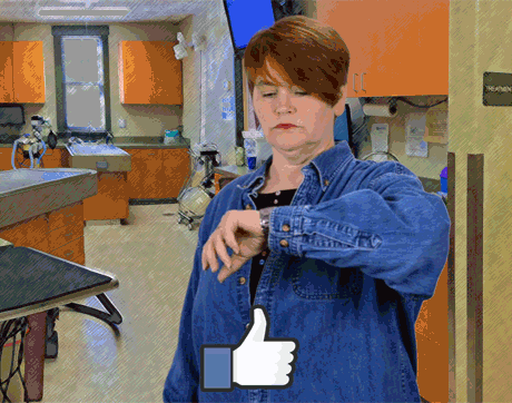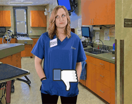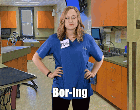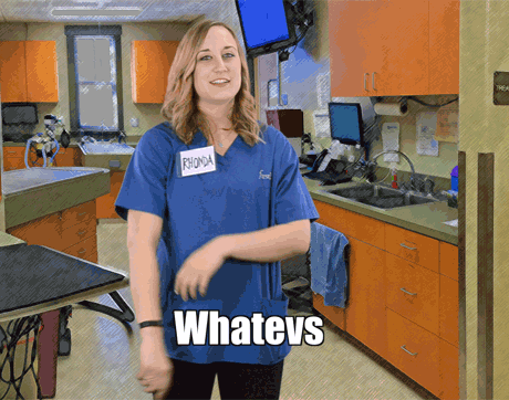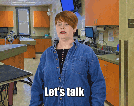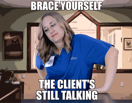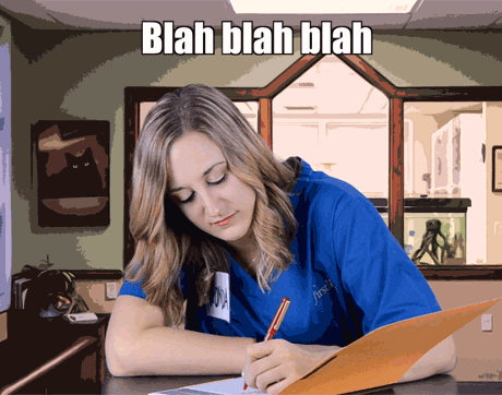 Rhonda's body language says to clients: “Shut your pie hole!” This team member's got one arm on the table-and one foot out the door. We sure hope she doesn't shut the door before the pet owners finish explaining why they're here to see Dr. Cares.