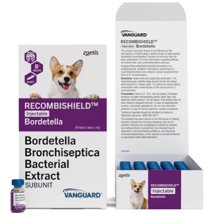 Vanguard Recombishield by Zoetis is a nonadjuvanted, recombinant injectable vaccine for protecting dogs 8 weeks of age and older against kennel cough (Bordetella bronchiseptica). The therapy uses pertactin protein to mount an immune response to B bronchiseptica, making it the only vaccine for dogs with this protein. Additionally, it contains recombinant technology to minimize patient pain, swelling, stinging, and sensitivity.