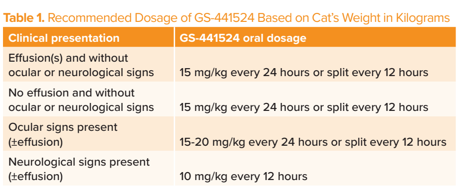 The dosage of GS-441524 depends on the type of FIP, the cat’s weight (Table 1), and clinical responses. A minimum of 84 days of total treatment is recommended in all cases.