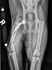 A 2-year-old male cheetoh cat (Bengal/ocicat cross) named Atlas came to the University of California, Davis School of Veterinary Medicine after a jumping accident left him lame. The Orthopedic Surgery Service at the UC Davis veterinary hospital took x-rays of Atlas, finding a displaced fracture of the right femoral head that would need surgery. After discussing the options with owners Sheila Dukas-Janakos and Ross Hite, Atlas received a total hip replacement, which utilizes a stem implant placed in the femur topped with a ball joint that interacts with a cup implanted in his pelvis.1