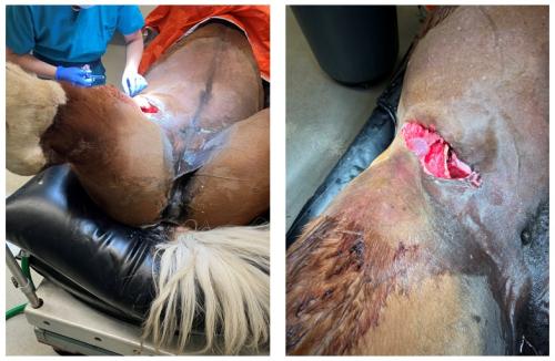 After a workup was conducted by the equine emergency team on site, they discovered that there was significant damage to Daisy Mae’s abdominal wall, meaning she needed surgery. She was prepped by an anesthesiologist and Sandra Valdez, DVM, DACVs-LA, DABVP (Equine), along with surgical residents Bridget Ratliff, DVM, and Laurel Saldinger, DVM, cleaned and then gently explored the wound to discover the extent of the damage.1