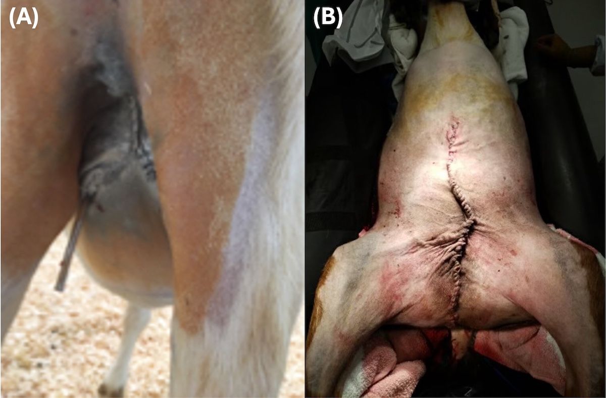 Overall survival outcomes for mastectomy in ruminants are good and can prolong the life of an animal, particularly when the animal is healthy and has severe mammary gland disease.2,4 The patient’s condition postoperatively is generally marked by improvements to ambulation and systemic health, including superior attitude and appetite.