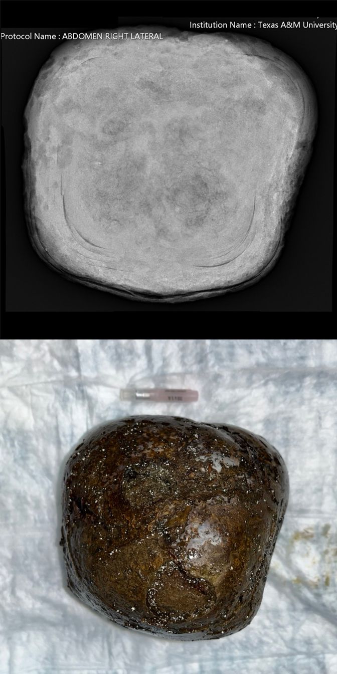 Major was able to remove the 5-pound stone during the colic surgery and after discussing with Harvey, they determined that the enterolith was caused by a high diet of alfalfa combined with high calcium content in the water in Crosby, the town they are from. X-rays were performed on the stone to see if they could determine what was at the center, but the results came back inconclusive.