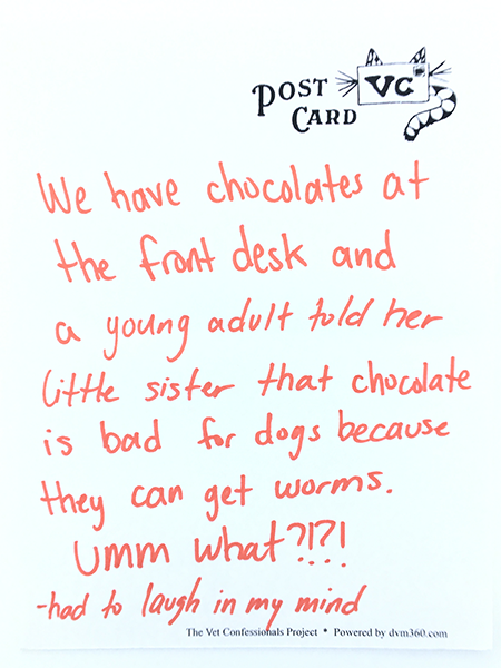 We have chocolates at the front desk and a young adult told her little sister that chocolate is bad for dogs because they can get worms. Umm what?!?! –had to laugh in my mind